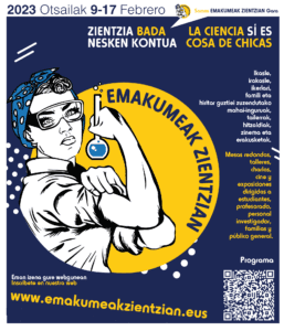 La programación de Emakumeak Zientzian 2023 se concentrará en la semana del 8 al 17 de febrero. Se ha diseñado un amplio programa de más de 50 actividades y sorpresas, que abarcan campos de investigación de diversa índole gracias a la unión de distintos centros, para que el mensaje de que ‘la ciencia sí es cosa de chicas’ llegue y cale en el mayor número posible de personas. En esta nueva edición, también se ha ampliado el ámbito geográfico gracias a la participación de entidades vizcaínas, de forma que el programa se extiende en Gipuzkoa y Bizkaia, principalmente en las capitales.