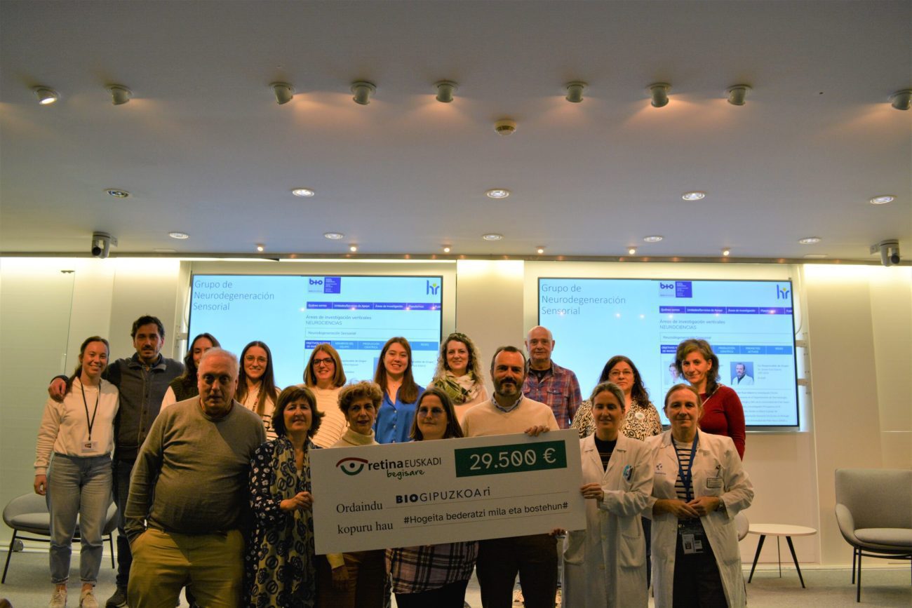 El 6 de marzo tuvimos la visita de varias personas de la Asociación Begisare en Biogipuzkoa. Esta asociación apoya a afectados y afectadas de problemas de retina y otras enfermedades causantes de baja visión y ceguera. Parte de su labor es promover la investigación de estas enfermedades y, así, entregaron un cheque de 29.500€ al grupo de Neurogeneración Sensorial. Además, las y los investigadores dieron unas charlas para contarles el trabajo que realizan e hicieron una visita a nuestras instalaciones.