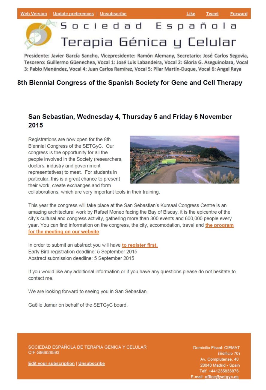 Del 4 al 6 de noviembre se va a celebrar en el Kursaal de San Sebastián el octavo congreso bianual de la Sociedad Española de Terapia Génica y Celular (SETGyC).