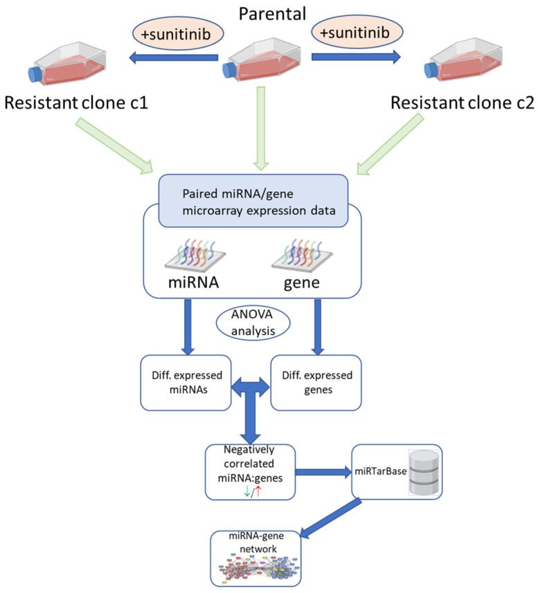 Uno de los estudios llevado a cabo por investigadores de Biodonostia, ha contribuido a identificar las interacciones génicas miRNA o dianas implicadas en la resistencia al Sunitinib en un modelo in vitro, mediante análisis de microarrays. Asimismo, mediante análisis de datos ómicos integrados, se han identificado diferentes vías de resistencia que sugieren que las células tumorales tienen muchas formas de superar el tratamiento con Sunitinib.