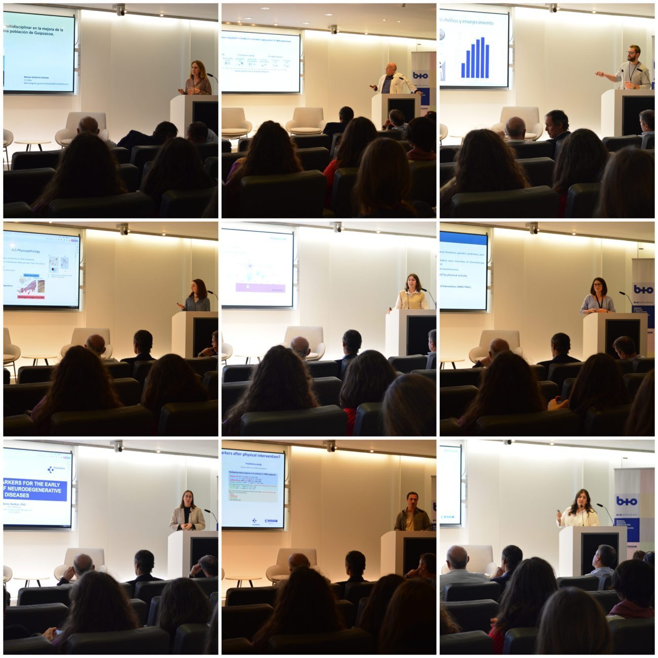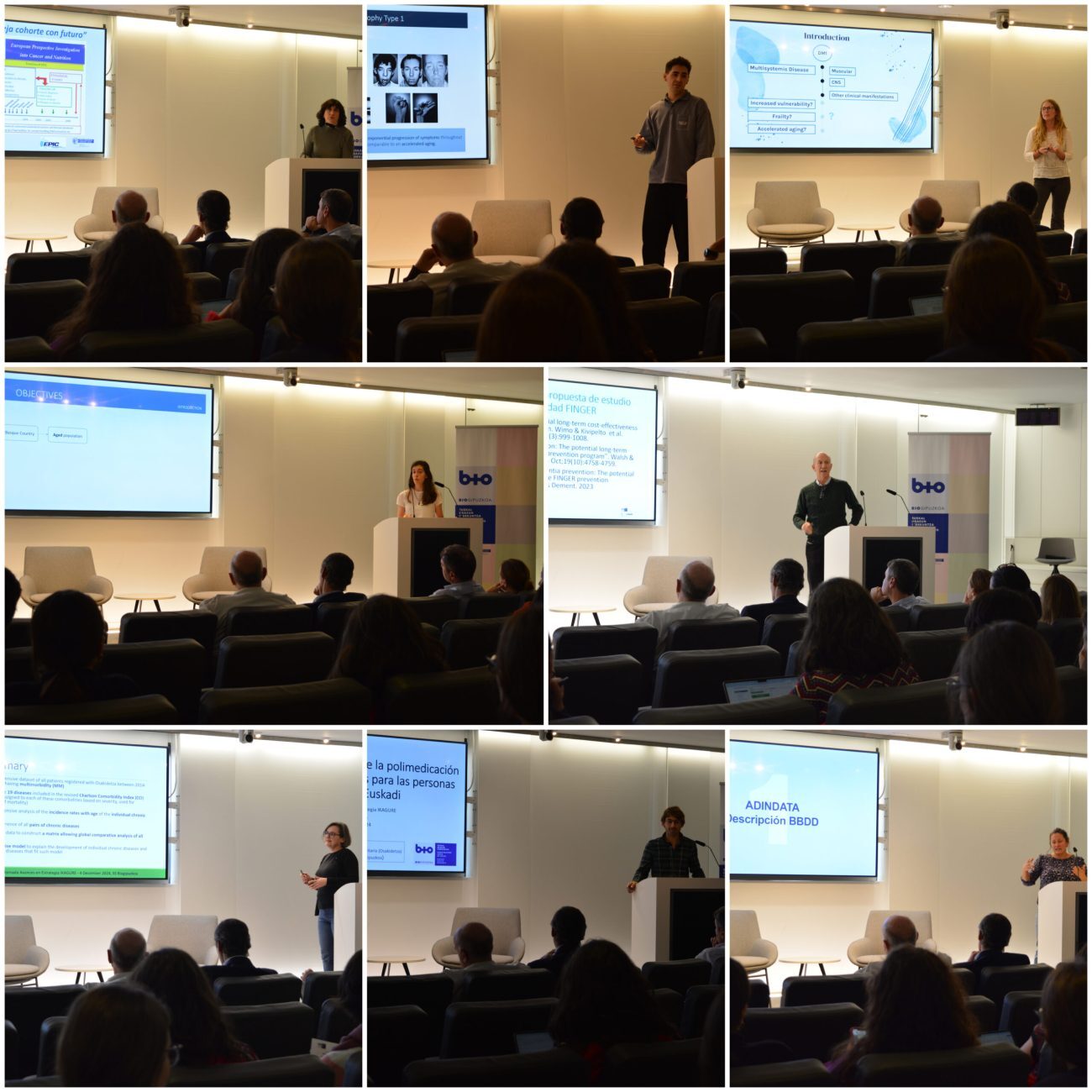 La jornada giró a continuación en torno a cuatro grandes bloques, con en torno a 30 intervenciones breves de investigadores de diferentes perfiles y pertenecientes a distintos grupos de investigación del Instituto. En primer lugar, se presentaron los avances en caracterización de los determinantes biológicos responsables del envejecimiento, así como avance en la identificación de su sustrato fisiopatológico común. A continuación, se habló del estudio de la fragilidad y de las intervenciones para su reversión, para continuar mostrando los avances en el estudio de la carga epidemiológica, social y económica del envejecimiento y enfermedades asociadas. Finalmente, se consideraron los avances que han tenido lugar en la identificación de factores ambientales y biológicos del envejecimiento saludable humano y los que provocan envejecimiento prematuro.