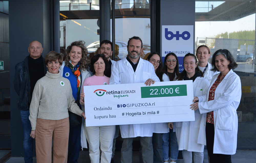 El jueves 6 de febrero el Instituto de Investigación Sanitaria Biogipuzkoa recibió la visita de un grupo de personas pertenecientes a la Asociación Retina Euskadi Begisare. Esta asociación, que apoya a personas afectadas de distrofias hereditarias de retina y otras enfermedades causantes de baja visión y ceguera, hizo entrega de un cheque por valor de 22.000€, dando continuidad a su labor de promover la investigación de estas enfermedades.