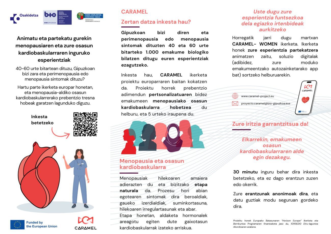 Osakidetzaren Biogipuzkoa Ikerketa Sanitarioko Institutuak, CARAMEL ikerketa europarraren esparruan eta Lehen Mailako Atentzioko Unitateko ikertzaile-taldearen bitartez, Gipuzkoan bizi diren 40 eta 60 urte bitarteko 1.000 emakume bilatzen ditu, haien osasun kardiobaskularra ikertu eta tresna digitalak garatzeko, emakumeen menopausia aldiko gaixotasun kardiobaskularren prebentzioa eta detekzio goiztiarra hobetzeko eta emakumeak osasunaren gestio aktiboan ahalduntzeko helburuarekin.