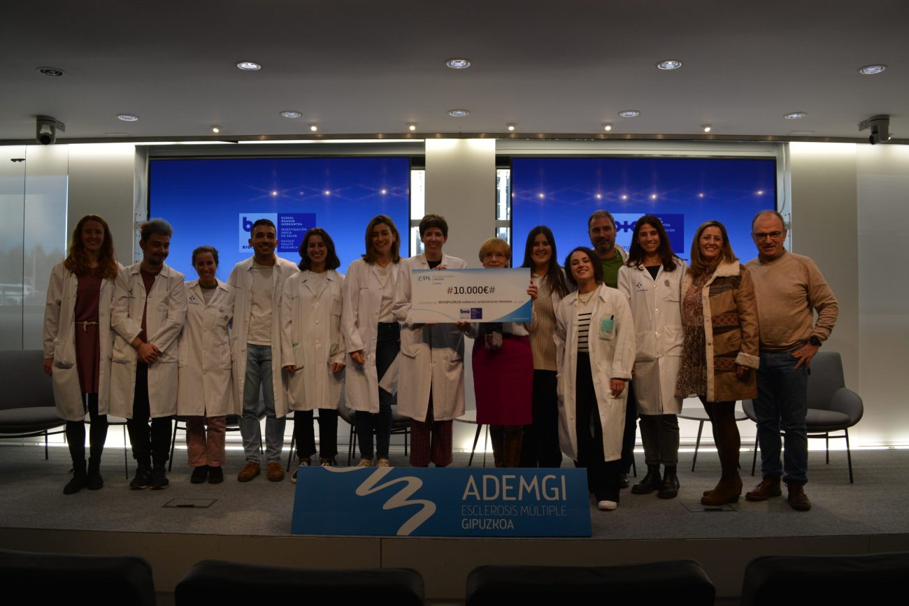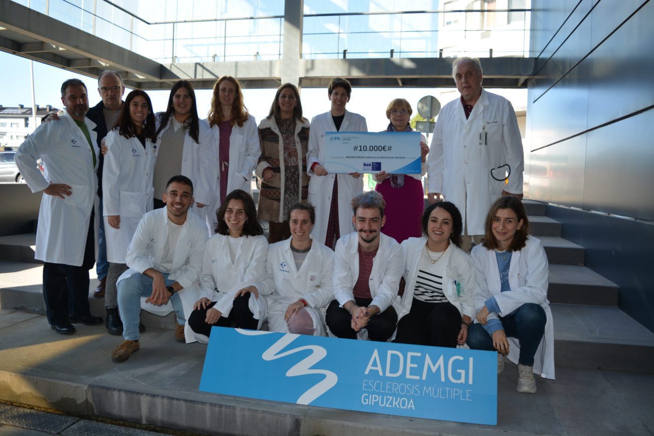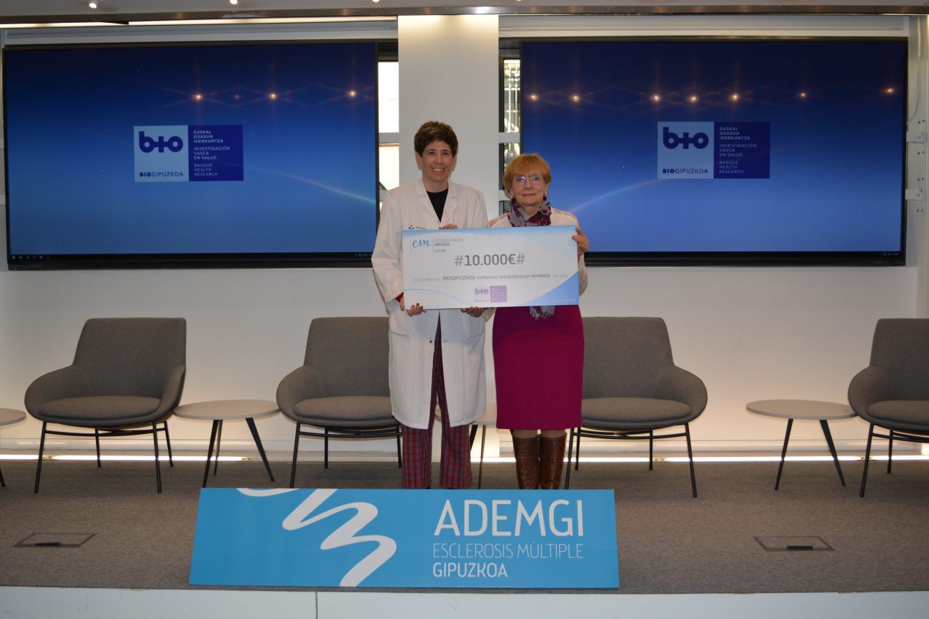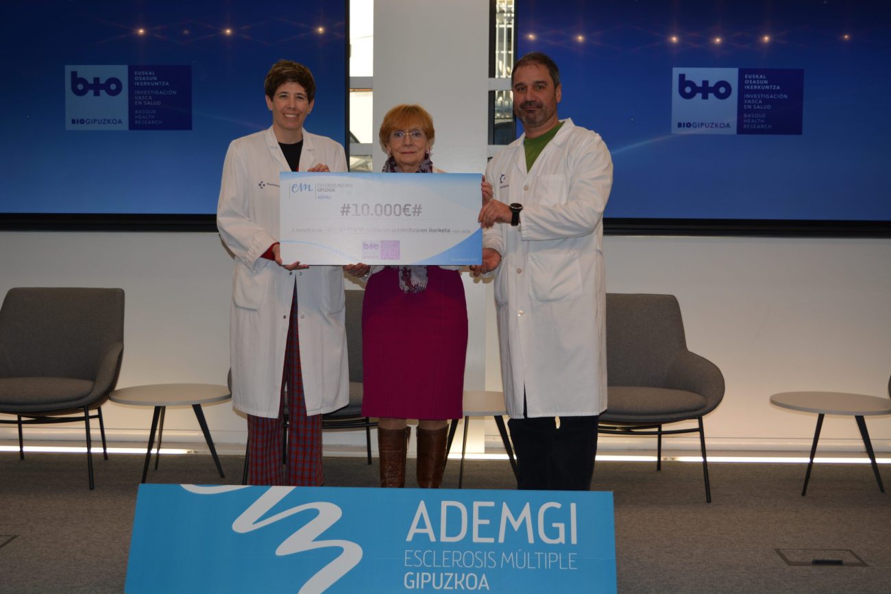 Txekea Maria Luisa Ustarrozek, ADEMGIko lehendakariak, eman du. Txekea ematerakoan esan duen bezala, “Ahal dugun neurrian, ADEMGIk ikerketa babesten du. Biogipuzkoako taldeari eskerrak eman nahi dizkiogu, joan daitezkeen jarduera guztietan beti laguntzen baitigute eta haien jarrera onagatik.”. Neuroimmunologiako taldearen izenean txekea Tamara Castillok eta David Otaeguik jaso zuten. Castilloren hitzetan “Donostia Unibertsitate Ospitaleko esklerosi anizkoitzeko unitatetik eta Biogipuzkoako Neuroimmunologia taldetik asko eskertzen da paziente-elkarteek pazienteekin eta haien senideekin batera gaixotasun honen ikerketa sustatzeko egiten duten ahalegina. Laguntza hori funtsezkoa da zergatik gertatzen den hobeto ulertzeko eta tratamenduetan sakontzen jarraitzeko eta, beraz, pazienteen bizi kalitatea hobetzeko. Ikerketa funtsezko oinarria da, eta, halakop ekimenei esker, pazienteentzat lanean jarrai dezakegu taldean.”