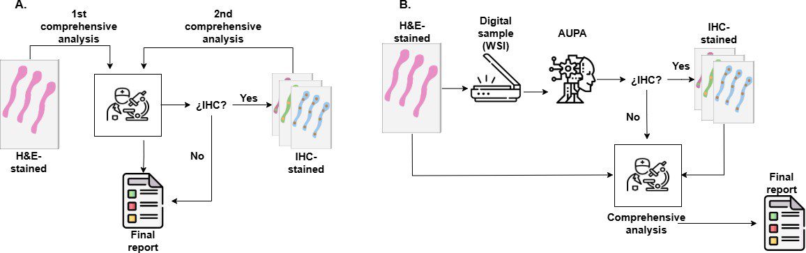 Irudian, aipatutako bi lan-fluxuak ageri dira. Ezkerrean lan-flluxu estandarra agertzen da, egungoa, patologoak egindako bi berrikuspenekin (lehenengoa immunohistokimikako tindaketak eskatzeko eta bigarrena azken diagnostikoa egiteko). Eskuinean, lan-fluxu digitala agertzen da, AAren eredua integratuta (ereduak automatikoki eskatuko lituzke immunohistokimikaren tindaketak, eta patologoak behin bakarrik berrikusiko luke kasua, azken diagnostikoa zuzenean emateko).