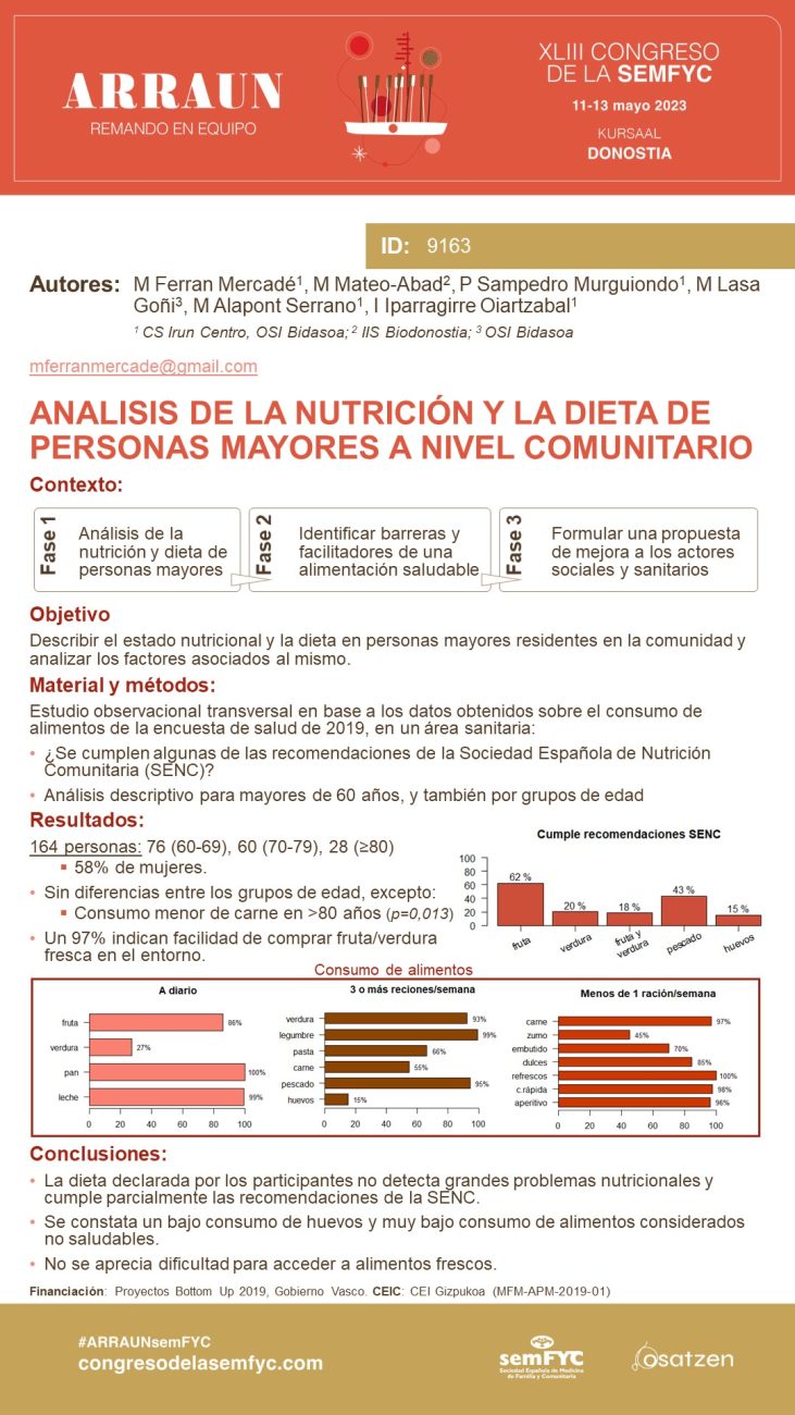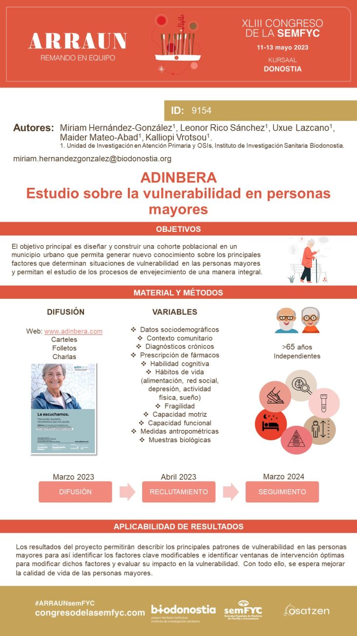 Era berean, Biodonostia Posterren Ponentzien atalean egon da honako lan hauekin: Abordaje de la fragilidad en atención primaria: evaluación de la efectividad de una intervención multifocal mediante un ensayo clínico aleatorizado (Leonor Rico), ADINBERA: Estudio sobre la vulnerabilidad en personas mayores (Miriam Hernández), Análisis de la nutrición y la dieta de personas mayores a nivel comunitario (Maider Mateo-Abad), Hospitalización a Domicilio: desarrollando una herramienta para predecir la carga de trabajo asistencial (Kalliopi Vrotsou), Retos y oportunidades en investigación en atención primaria (Uxue Lazcano) eta Residencias gerontológicas afectadas por COVID 19: mortalidad y diferencias en los perfiles de riesgo (Uxue Lazcano). (Poster guztiak hemen eskuragarri).