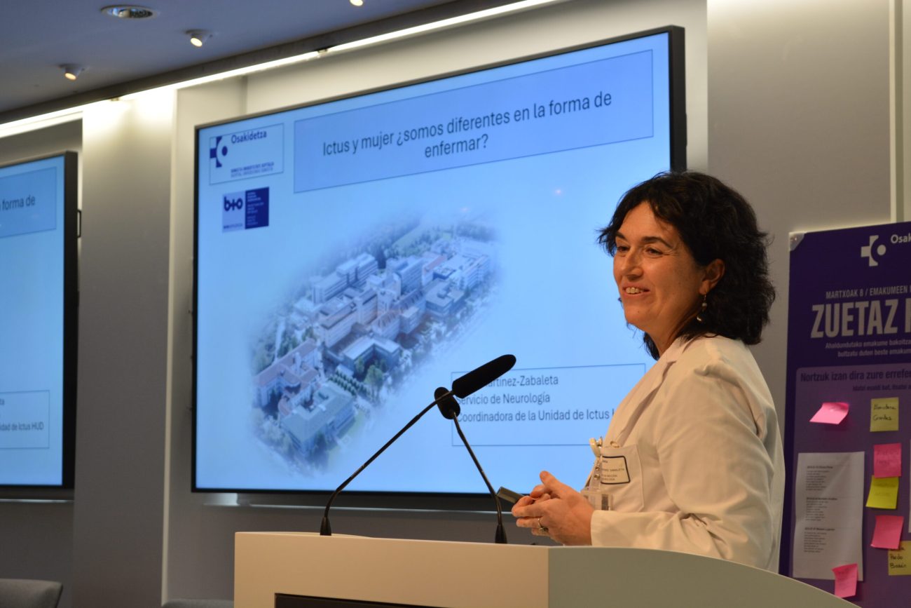 Jardunaldiari amaiera emateko, gure lankide Maite Martínez Zabaletak, ICTUS taldekoak eta Donostiako Unibertsitate Ospitaleko Iktus Unitateko koordinatzaileak, “ Ictus y mujer, ¿Somos diferentes en la forma de enfermar?” izeneko hitzaldia eman zuen. Hitzaldian iktus iskemikoari buruzko ikerketa bat azaldu zuen, Donostia Unibertsitate Ospitaleko iktus-unitatean izandako ospitaleratzeak oinarritzat hartuta. Hala, emakumeen behar espezifikoetara egokitutako prebentzio- eta arreta-programa espezifikoak garatzea espero dute, eta genero-ikuspegiak osasun-ikerketan duen garrantziaren adibide da.