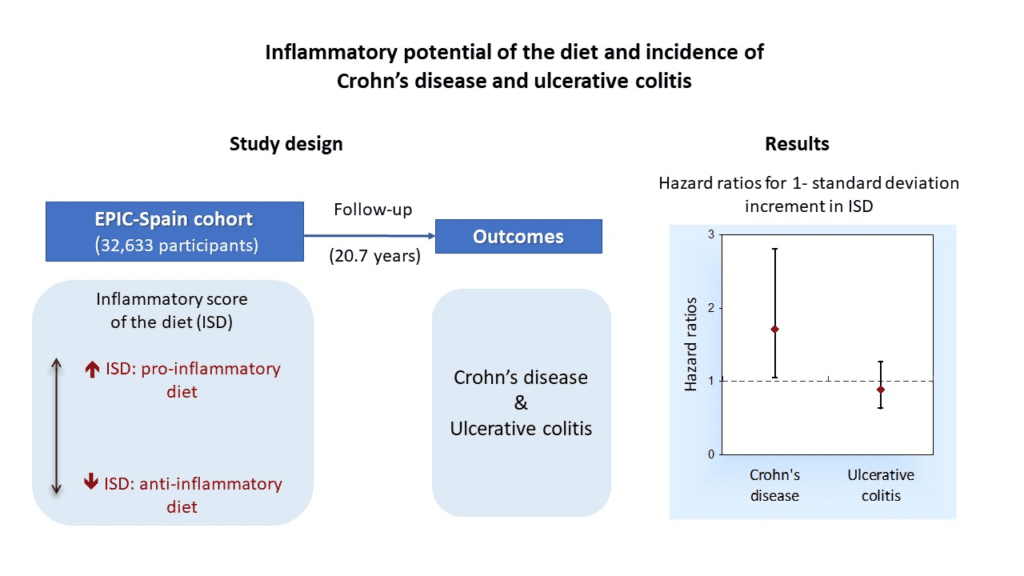 EPIC-Españaren azterlanak 29 eta 69 urte bitarteko 32.633 parte-hartzaile aztertu ditu. Horietan, dietaren hantura-potentziala neurtu da dieta hanturako Score bat (ISD) erabiliz, zeinak ezartzen dituen erreklutamenduan neurtutako dietaren hantura-maila, historia dietetikoaren eta beste aldagai batzuen bidez. 21 urtez egindako jarraipenetik lortutako emaitzen arabera (674,547 pertsona urtean), hantura sor dezakeen dieta kontsumitzeak KG garatzeko arriskua eragin dezake (HR 1.71; % 95 CI: 1.05-2.80; p = 0.031). Ez da ikusi ISD gehitzearen eta UKa gehitzearen arteko loturarik (HR 0.89; % 95 CI: 0.66-1.19; p = 0.436). Emaitzen arabera, dieta osasungarri eta orekatu bat onuragarria izan daiteke prebentzioan. Hala ere, ikerketa zabalagoak beharko dira aurkikuntza horiek egiaztatzeko.