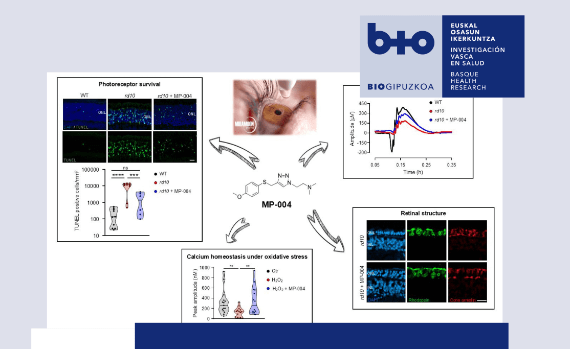 Biogipuzkoa Osasun Ikerketa Institutuko Neuroendekapen Sentsorialaren eta Gaixotasun Neuromuskularren taldeek, Miramoon Pharmarekin batera, erretinosi pigmentarioa tratatzeko molekula esperantzagarri bat garatu eta probatu dute saguetan. Ikerketa hau Investigative Ophthalmology & Visual Science (IOVS) nazioarteko aldizkari zientifikoan argitaratu da, eta Klaudia González-Imaz, Araceli Lara-López, María Rodríguez-Hidalgo, Miren Sarasola-Gastesi, Adolfo López de Munain, Ainara Vallejo-Illarramendi eta Javier Ruiz-Ederrari esker egin ahal izan da.