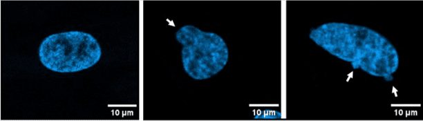 2.irudia: Zelula-nukleoaren morfologiaren azterketa. LGMDR1 duten gaixoen nukleoek morfologia anomaloa agertzen dute. Ezkerrean, kontrol osasuntsuetan morfologia; erdian eta eskuman, LGMDR1 duten pertsonetan morfologia.