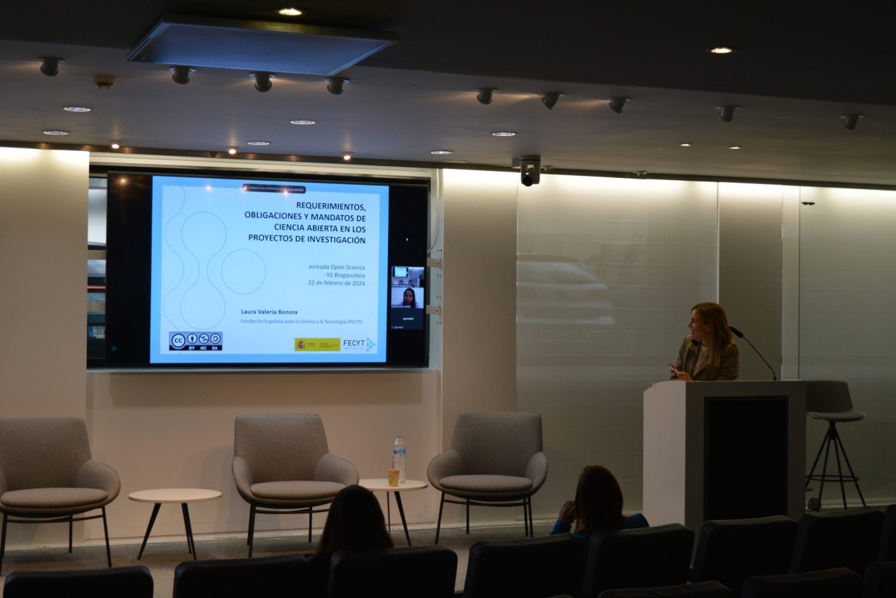 Kaferako tartean ostean, Laura Bonorak (FECYTeko Zientzia eta Berrikuntza Politiken analista) aritu zen ikerkuntza-proiektuetan Zientzia Irekiak duen lekuaz. Azaldu zuen Zientzia Irekia oztopoak (diru publikoa gastatzea, informazio-galera, azpiegitura gabezia eta hornitzaileekiko depenentzia) kentzea dela, datuen ustiaketa kaltetu gabe eta kalitatea kaltetu gabe. Zientzia Irekia proiektuetan bermatzeko, artikuluak eta berari lotutako datuak depositatzea beharrezkoa dela nabarmendu zuen, estatu- eta Europa-mailan ezberdintasunak badaude ere. Ondorioz, ikerkuntza-proiektuetan kudeaketa hori nola egingo den idatzi behar dela azpimarratu zuen eta hori egiteko hainbat gomendio eman zituen. Gainera, behin proiektuak onartuta, datuen kudeaketan egin beharreko pausuak eta eskuragarri dauden lanabesak azaldu zituen.