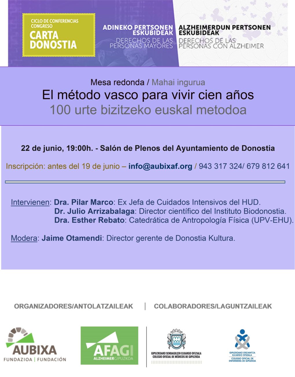 La mesa redonda que protagonizarán la doctora Pilar Marco, el director de Biodonostia Julio Arrizabalaga y la catedrática de Antropología Biológica de la EHU/UPV Esther Rebato, junto a Jaime Otamendi se enmarca dentro del ciclo de conferencias y seminarios con los que la Fundación Aubixa y AFAGI están preludiando la celebración de un congreso, el próximo 20 de octubre, en el que serán presentadas sendas ‘Cartas Donostia’ sobre los derechos de las personas mayores y sobre los derechos de las personas con Alzheimer y otras demencias.