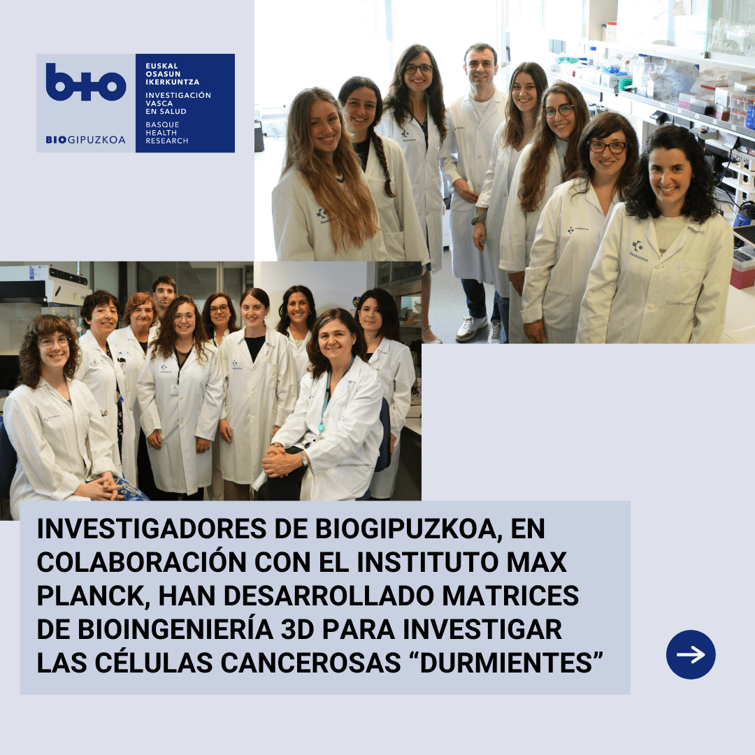 En un trabajo liderado por el grupo de Bioingeniería en Regeneración y Cáncer del Instituto de Investigación Sanitaria Biogipuzkoa, y en colaboración con el Instituto Max Planck, se ha desarrollado un modelo basado en matrices de bioingeniería 3D que permite investigar las células cancerosas “durmientes”. En este trabajo han participado las y los investigadores de los grupos de Biogipuzkoa, Bioingeniería en Regeneración y Cáncer y grupo de Cáncer de Mama, Unai Heras, Andrea Abaurrea, María Caffarel y Amaia Cipitria, junto a investigadores/as de Onkologikoa, UPV/EHU y varias instituciones de Alemania. Este nuevo trabajo se ha publicado en la revista Science Advances.