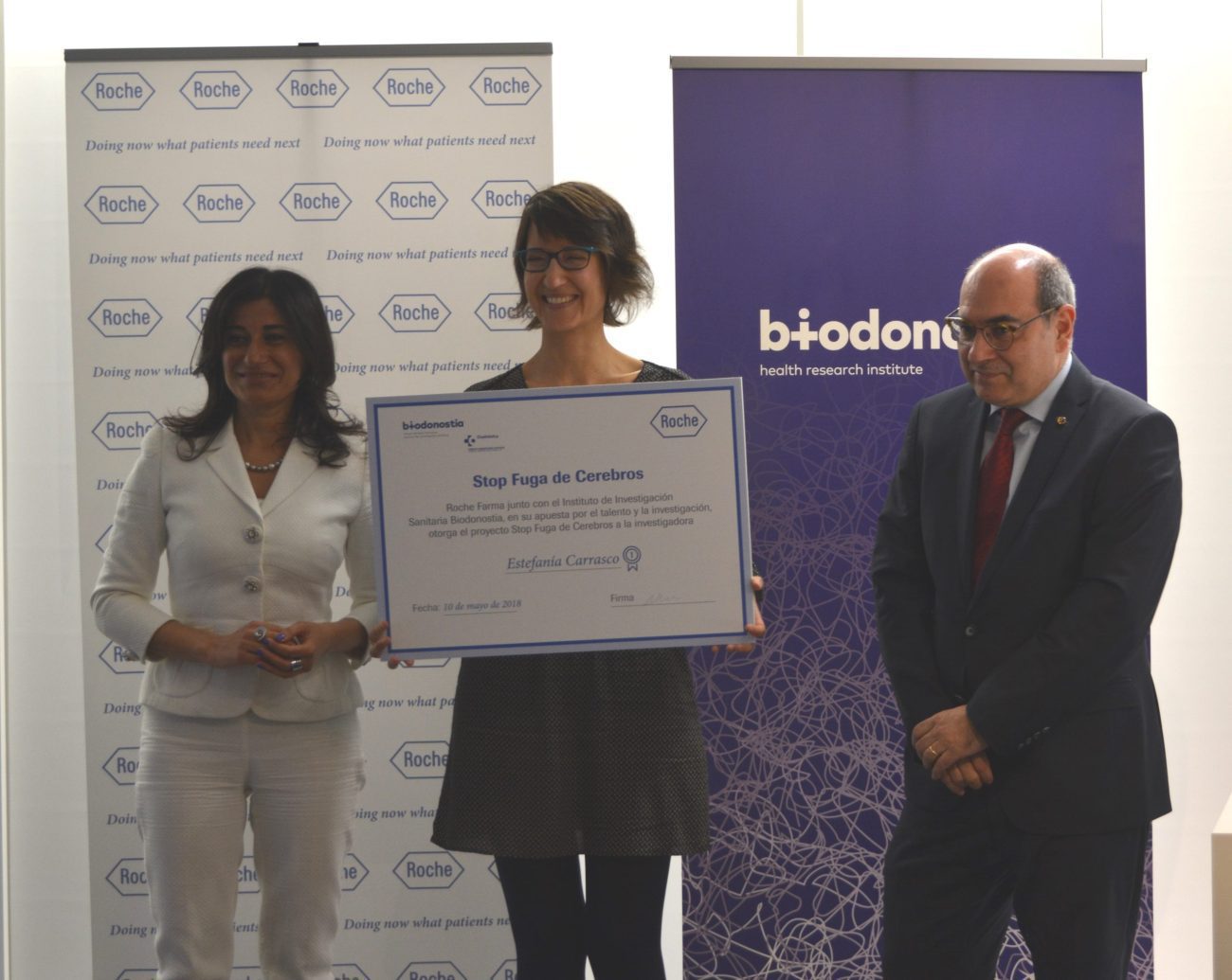 La sede del IIS Biodonostia en San Sebastián ha acogido hoy el acto de entrega de la beca ‘Stop Fuga de Cerebros’, iniciativa lanzada por Roche Farma con el objetivo de retener el talento de investigadores que se ven obligados a salir del país por la falta de recursos para desarrollar sus proyectos. En esta ocasión, la beca ha recaído en Estefanía Carrasco, quien podrá continuar con su proyecto de investigación en el Instituto de Investigación Sanitaria Biodonostia.