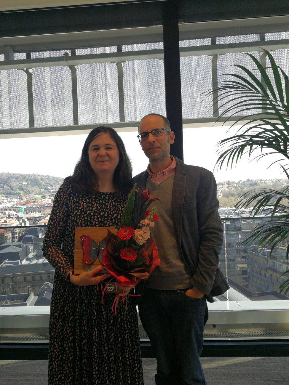 Nuestra compañera Maria Caffarel, colider del grupo Cáncer de mama del Instituto de Investigación Sanitaria Biogipuzkoa, ha recibido un premio en la primera edición de EMAKUMEEKINN. Con estos premios Fomento San Sebastián quiere reconocer a las mujeres que contribuyen al desarrollo del espíritu emprendedor y al impulso de la innovación en la ciudad. En concreto, María lo ha recibido en la categoría de “mujeres investigadoras que impulsan las vocaciones STEAM”; y le ha sido entregado de manos de Marisol Garmendia (concejala de Economía Local y Empleo) en el acto que hoy se ha celebrado en el Edificio EKINN. En este acto también han estado presentes Eneko Goia (alcalde Donostia – San Sebastián) e Iñigo Olaizola (director gerente de Fomento San Sebastián) y han sido también galardonadas Marianela Guarda y ViveBiotech, en las categorías mujeres emprendedoras y empresas que apuestan por la innovación y el talento femenino, respectivamente. Por su parte, María ha estado arropada por su familia y compañeras y compañeros de trabajo; y hemos aprovechado para preguntarle por este premio.